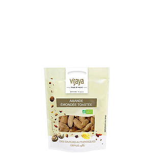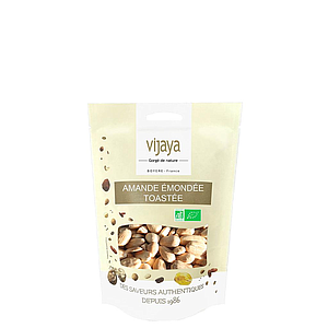L’amande est un fruit à coque, recouvert d’une enveloppe verte et veloutée au toucher (le brou), qui sèche et éclate à maturité, laissant apparaître une noix. Quand les amandes sont décortiquées et séchées, leur peau est brune. VIJAYA propose une sélection d’amandes émondées en provenance d'Espagne, que nous toastons nous-mêmes.