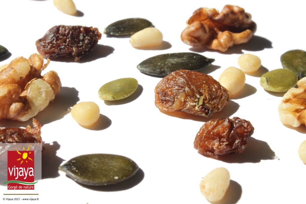 Le Mélange Salade VIJAYA, composé de Raisin Sultanine, Pignon de Pin, Graine de Courge et Cerneaux de Noix, est riche en apports nutritionnels et agrémente facilement les repas.